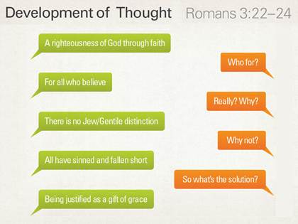 Paul explains that this righteousness is not some new thing, although it has been anticipated throughout the Old Testament. Instead of restricting this righteousness to a chosen group, God has made it freely available to all who believe in Jesus. Paul characterizes it in 3:21 as an “apart-from-the-law” righteousness, an idea that will be fleshed out in the following chapters. In 3:22, Paul restates the “righteousness of God” as if there is a need to add more detail about which righteousness he has in mind. He repeats this phrase to emphasize its importance and prompt his audience to read the verse as if it were a second pass at the same idea: God’s righteousness has not only been revealed and witnessed to, but it is a righteousness of God through faith rather than some other means, and it is available to all who believe, not just to the covenant community of Israel.