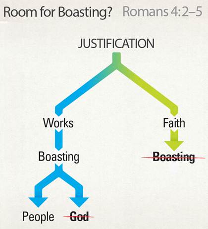 Room for Boasting? Justification by faith versus works leads to different outcomes. Justification by works might be something to boast about, but not before God. In contrast, justification by faith leaves no room for boasting, either before men or God.