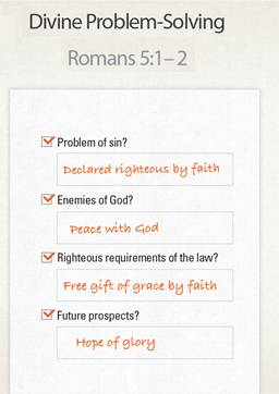 Divine Problem-Solving: In chapter 5 Paul shifts his letter from the consequences associated with the revelation of God’s wrath to the implications of the revelation of God’s righteousness. The introductory verse recounts all of the issues he has tackled and (at least preliminarily) answered.