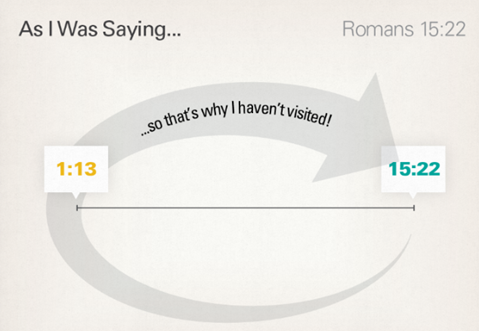 As I Was Saying: The letter to the Romans began with a clearly stated purpose: Paul’s desire to visit the church in Rome. But Paul carefully structured his letter around this formal purpose so he could go on to address important issues regarding how these believers understood the gospel. Finished with his exposition of the gospel and all its implications, Paul resumes the formal purpose of the letter by reiterating his desire to visit.